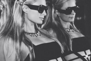 На черно-белых снимкажх мы видим Пэрис в необычном черном платье с тканевыми полосками вместо корсета. Естественно, под нарядом не было нижнего белья. Дополнила светская львица свой образ обручем с леопардовыми ушками, черные очки и колье с шипами.