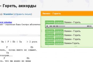 Для того чтобы прослушать песню, аккорды для которой вы смотрите (например,http://amdm.ru/akkordi/lumen/92156/goret), нужно кликнуть на закладку и на странице появится окошко с плеером как на скриншоте выше.
