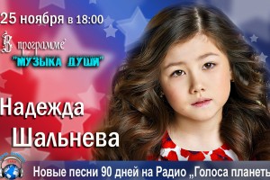 25 ноября в 18:00 на Радио «Голоса планеты» пройдет премьера новой музыкальной программы «Музыка души» с юной певицей и автором песен из Москвы Надеждой Шальневой. В программе прозвучат авторские песни, поэтом и композитором которых является 11-летняя талантливая девочка Надежда Шальнева. Это дебют Надежды на нашем радио в качестве автора песен. В программе прозвучат песни – «Россия – Родина моя!», «С добрым утром!» и «Детство» в исполнении автора – Надежды Шальневой.