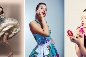 Девушки в стиле рокабилли предпочитают платья, юбки и блузки. Силуэт платья должен быть «диоровским», женственным. Платье (или блузка) должно подчеркивать грудь, на поясе они, как правило, перехватываются ярким ремешком. Юбка же непременно должна быть широкой, иметь крой «полусолнце» или солнце-клеш, чтобы развеваться во время танца вокруг ног. Лучше, чтобы она была еще и пышная. Такого объема обычно добиваются за счет пышных тканевых подъюбников. Как вариант «низа» можно рассмотреть плотные облегающие бриджи с отворотами.